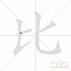 怎么写 此字《说文解字》篆形作「」,密也。二人为从,反从为比。楷书写法:左作一短横、一竖挑,右作一短横、一竖曲钩,共四画。此字左半竖挑易写为一竖、一挑,共五画,非标准字体写法。「仳」、「妣」、「屁」、「庇」、「批」、「昆」、「枇」、「皆」、「纰」等字偏旁同此。