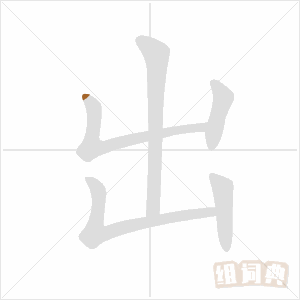 外部、自内至外。与「入」相对。《孟子.告子下》:「入则无法家拂士,出则无敌国外患者,国恒亡。」《儿女英雄传》第三三回:「那公子却也真个足不出户,目不窥园。日就月将,功夫大进。」 产生、出现。如:「出汗」、「出纰漏」。《玉篇.出部》:「出,见也。」《易经.说卦》:「万物出乎震。震,东方也。」《儒林外史》第一回:「元朝末年,也曾出了一个嶔崎磊落的人。」