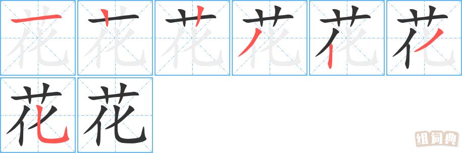 上作「艹」,四画;下半作「化」︰右作一横、一竖曲钩,写法参「