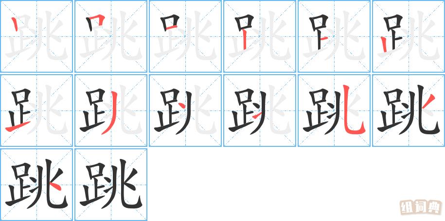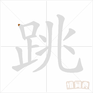 脚蹬地使身体往上、下或向前。如:「跳远」、「鸡飞狗跳」。《说文解字.足部》:「跳,蹶也。」《后汉书.卷八二.方术列传下.费长房》:「市中有老翁卖药,悬一壶於肆头,及市罢,辄跳入壶中。」《水浒传》第二三回:「那一阵风过处,只听得乱树背后,扑地一声响,跳出一只吊睛白额大虫来。」 越过。如:「跳行」、「跳级」。《说文解字.足部》:「跳,一曰跃也。」明.刘兑《金童玉女娇红记》:「全不问身跳龙门,名标雁塔。」