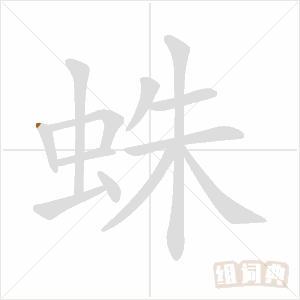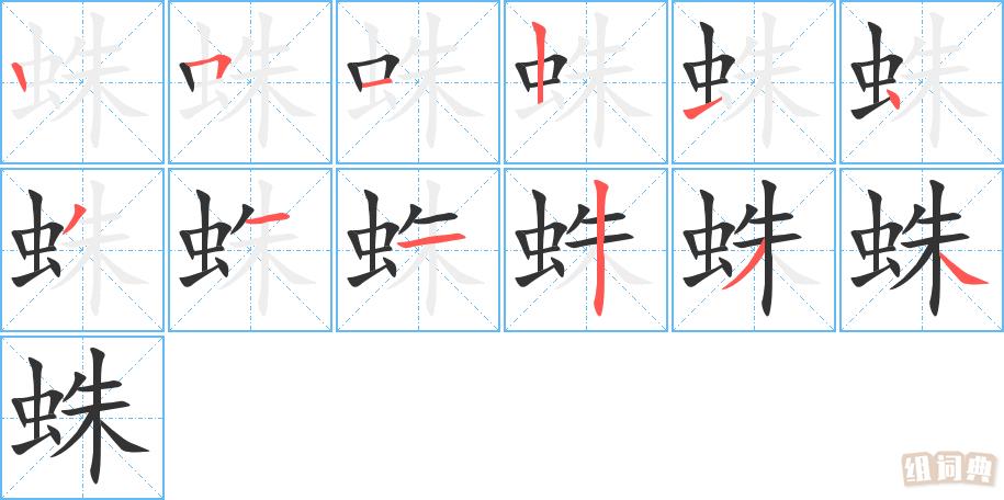 怎么写 此字《说文解字》正篆作「」,从黾,朱声。重文作「」。后通行重文之形,楷书写法:左半「虫」之下横笔斜挑,末作一点;右半作「朱」︰起笔作撇,中竖笔不钩,写法参「」字。