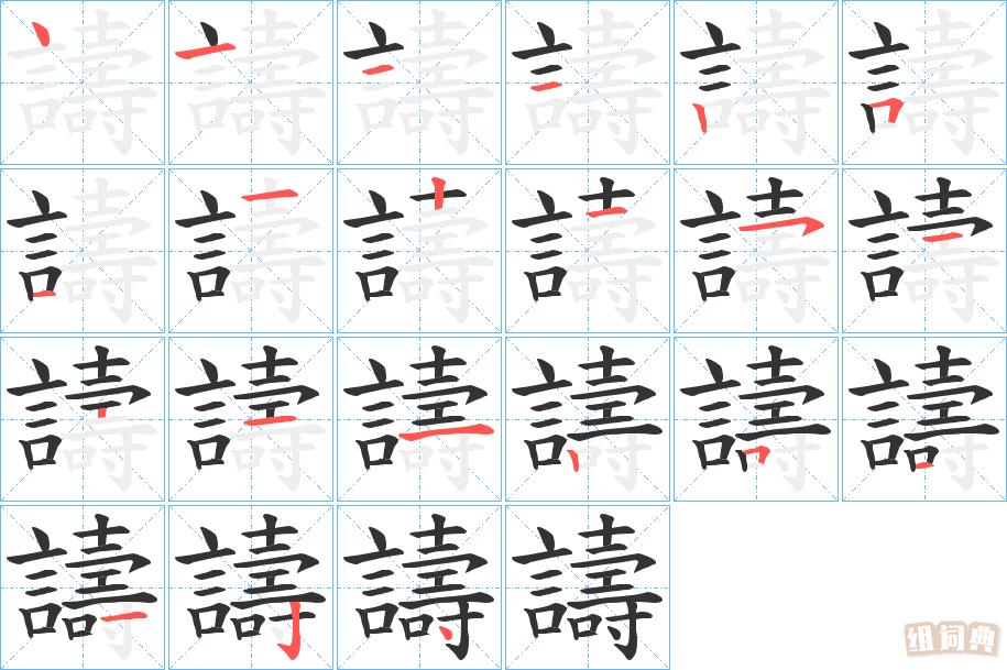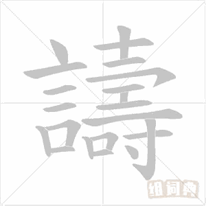诅咒。《说文解字.言部》:「譸,詶也。」清.段玉裁.注:「按:詶,诅也。则譸亦诅也。」 「譸张」:欺诈、诳骗。《龙龛手监.言部》:「譸,譸张,欺诳也。」《玉篇.言部》:「譸,譸张,诳也。」《书经.无逸》:「民无或胥譸张为幻,此厥不听,人乃训之。」南朝宋.刘义庆《世说新语.雅量》:「僧弥勃然作色曰:『汝故是吴兴溪中钓碣耳,何敢譸张?』」《聊斋志异.卷一.成仙》:「周惊怛欲绝,窃疑成譸张为幻。」