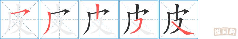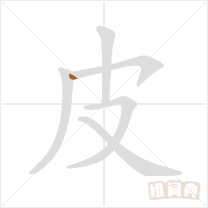 怎么写 此字《说文解字》篆形作「」,剥取兽革者谓之皮。从又,为省声。楷书写法:中竖与下「又」相接。「坡」、「彼」、「披」、「波」、「玻」、「疲」、「破」、「被」、「跛」、「簸」等字偏旁同此。若为左偏旁,捺笔改顿点,如︰「疱」、「颇」字。