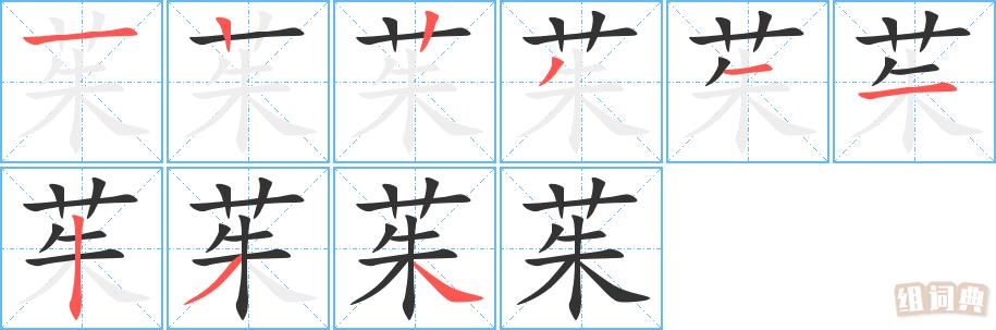 上作「艹」,四画;下半作「朱」︰起笔作撇,中竖笔不钩,写法参「